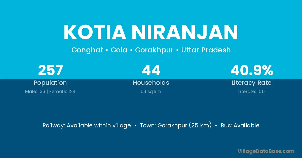 Gorakhpur (25 km) is the nearest town to Kotia Niranjan village for major economic activities and is located approximately 25 km away.