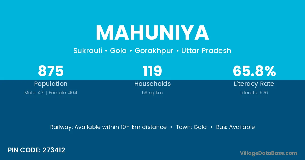 Mahuniya village has a total population of 875 people, of which 471 are males and 404 are females.