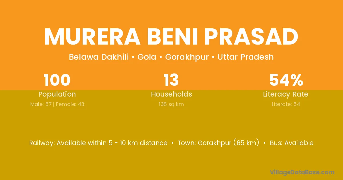 Gorakhpur (65 km) is the nearest town to Murera Beni Prasad village for major economic activities and is located approximately 65 km away.