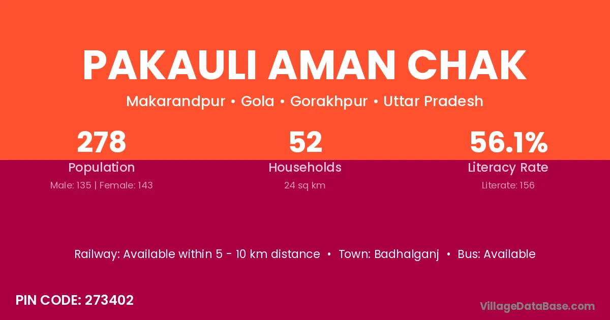 Pakauli Aman Chak village has a total population of 278 people, of which 135 are males and 143 are females.