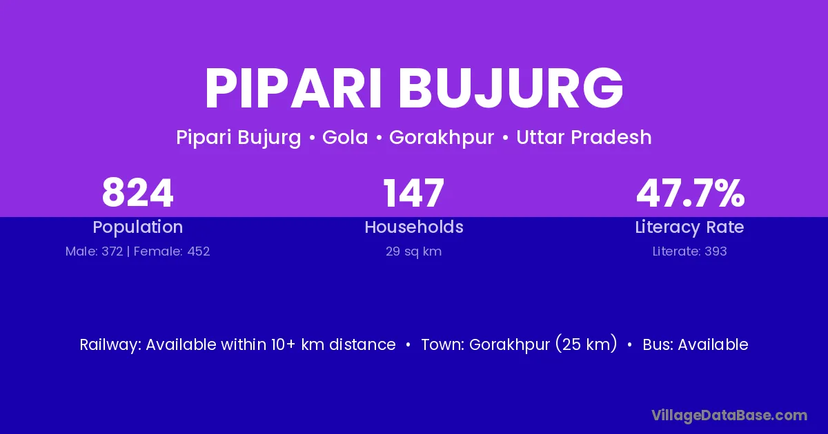 Gorakhpur (25 km) is the nearest town to Pipari Bujurg village for major economic activities and is located approximately 25 km away.
