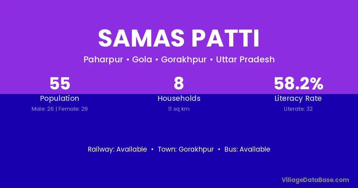 Samas Patti village has a total population of 55 people, of which 26 are males and 29 are females.
