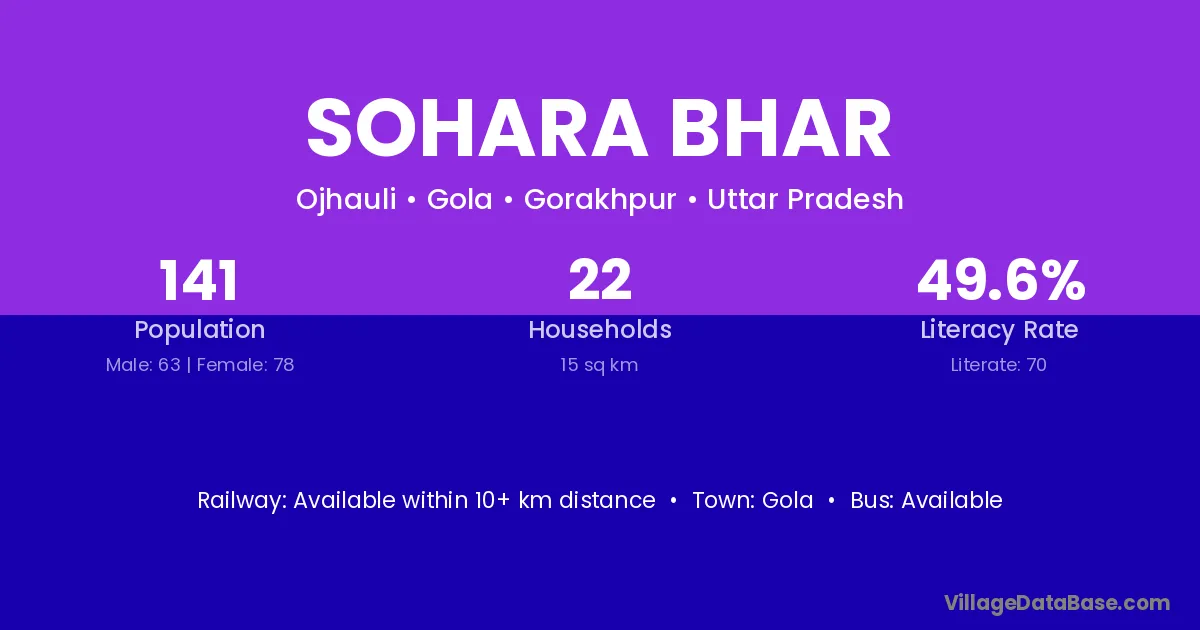Sohara Bhar village has a total population of 141 people, of which 63 are males and 78 are females.