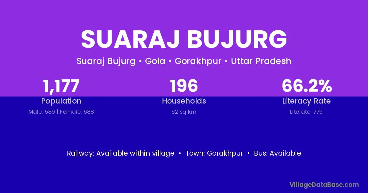Suaraj Bujurg village has a total population of 1,177 people, of which 589 are males and 588 are females.