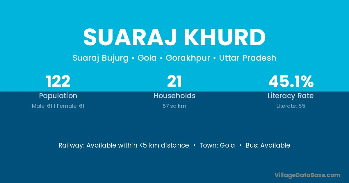 Suaraj Khurd village has a total population of 122 people, of which 61 are males and 61 are females.