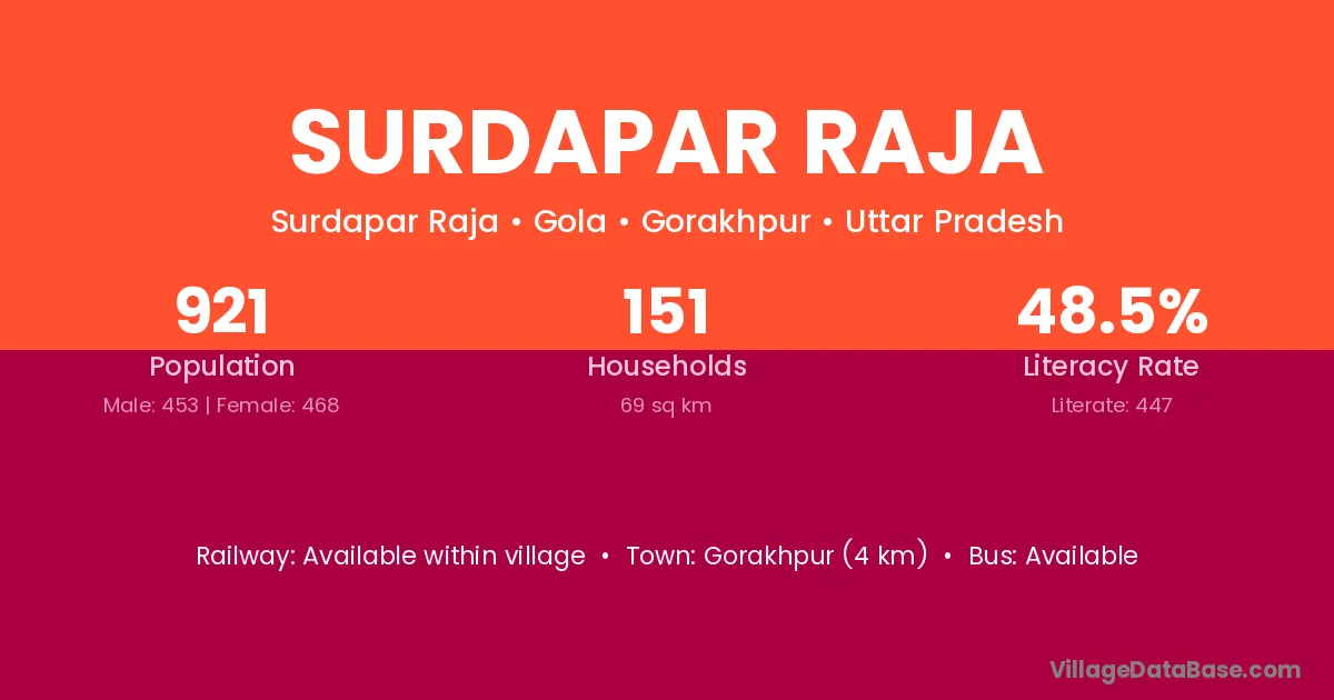 Surdapar Raja village has a total population of 921 people, of which 453 are males and 468 are females.