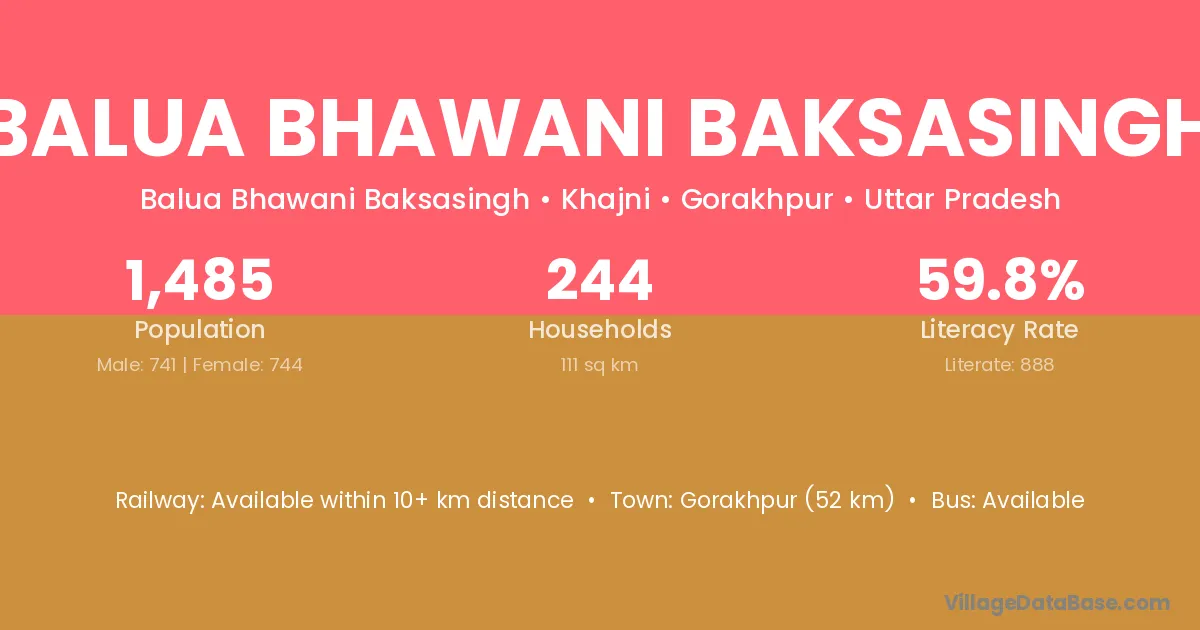 Balua Bhawani Baksasingh village has a total population of 1,485 people, of which 741 are males and 744 are females.