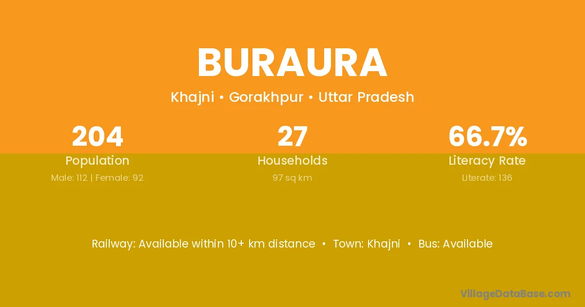 Buraura village has a total population of 204 people, of which 112 are males and 92 are females.