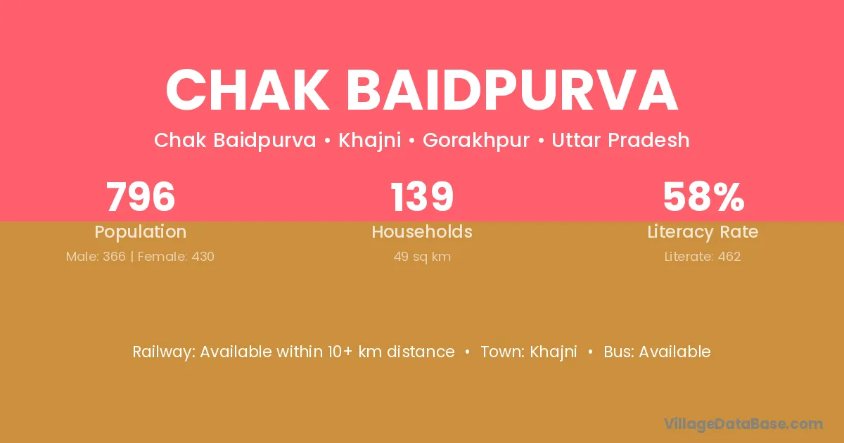 Chak Baidpurva village has a total population of 796 people, of which 366 are males and 430 are females.