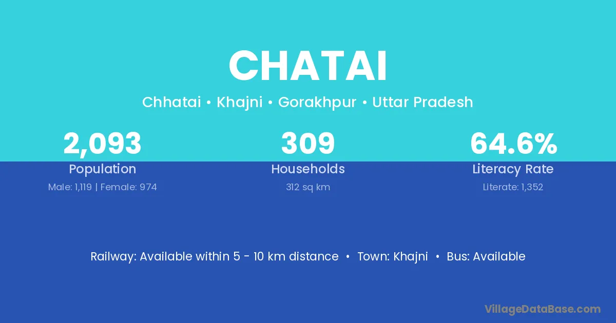 Chatai village has a total population of 2,093 people, of which 1,119 are males and 974 are females.