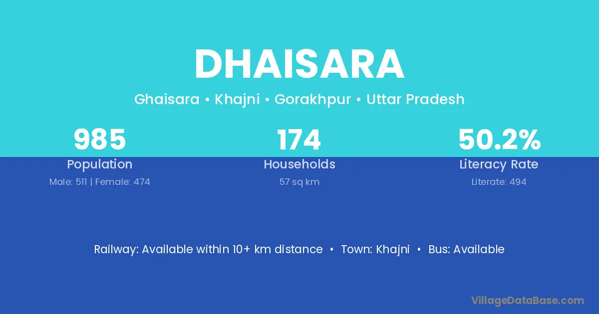 Dhaisara village has a total population of 985 people, of which 511 are males and 474 are females.