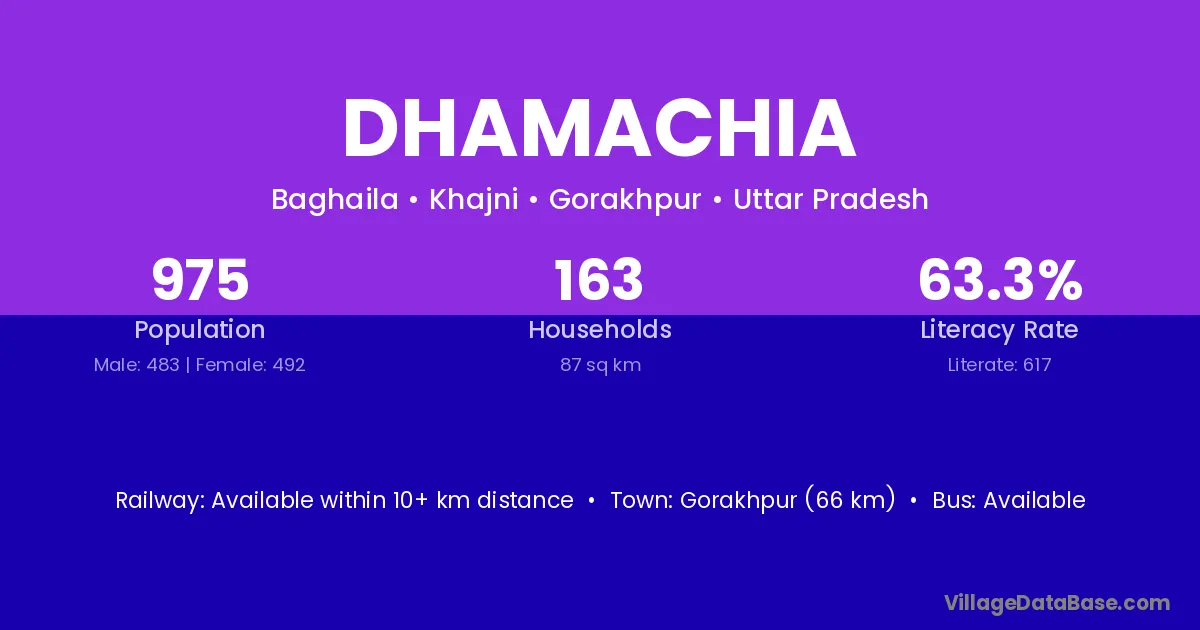 Gorakhpur (66 km) is the nearest town to Dhamachia village for major economic activities and is located approximately 66 km away.