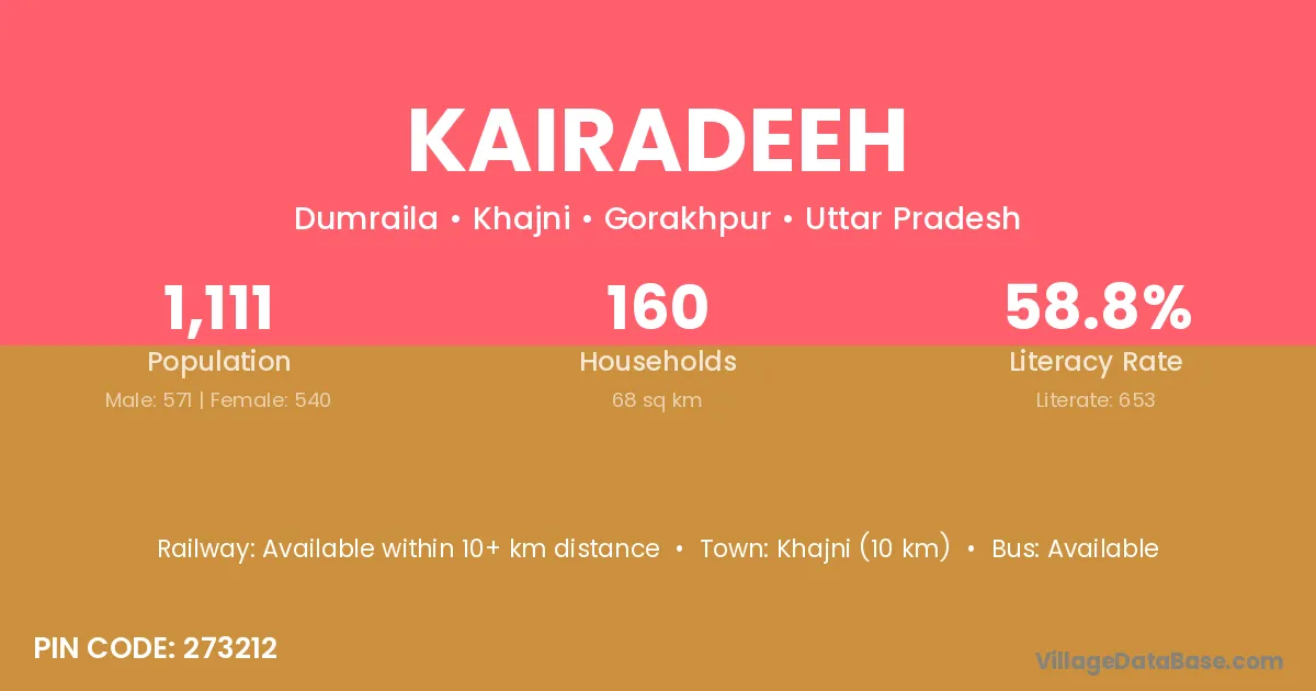 Khajni (10 km) is the nearest town to Kairadeeh village for major economic activities and is located approximately 10 km away.