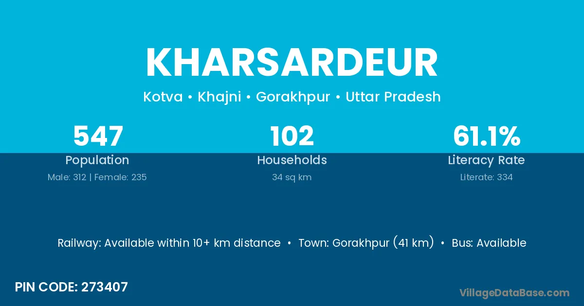 Gorakhpur (41 km) is the nearest town to Kharsardeur village for major economic activities and is located approximately 41 km away.