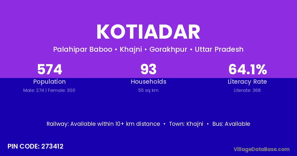 Kotiadar village has a total population of 574 people, of which 274 are males and 300 are females.