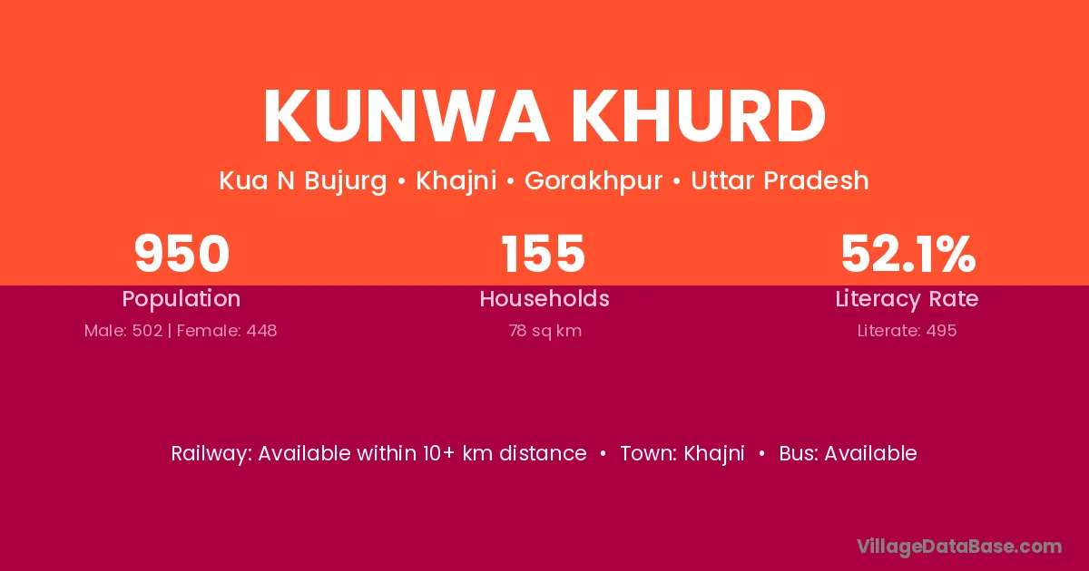 Kunwa Khurd village has a total population of 950 people, of which 502 are males and 448 are females.