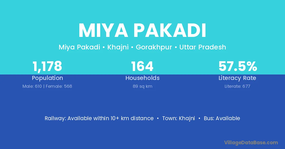 Miya Pakadi village has a total population of 1,178 people, of which 610 are males and 568 are females.