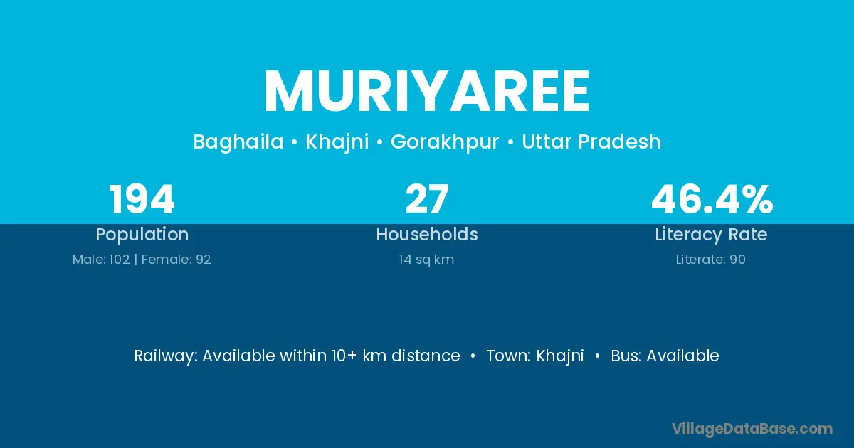 Muriyaree village has a total population of 194 people, of which 102 are males and 92 are females.
