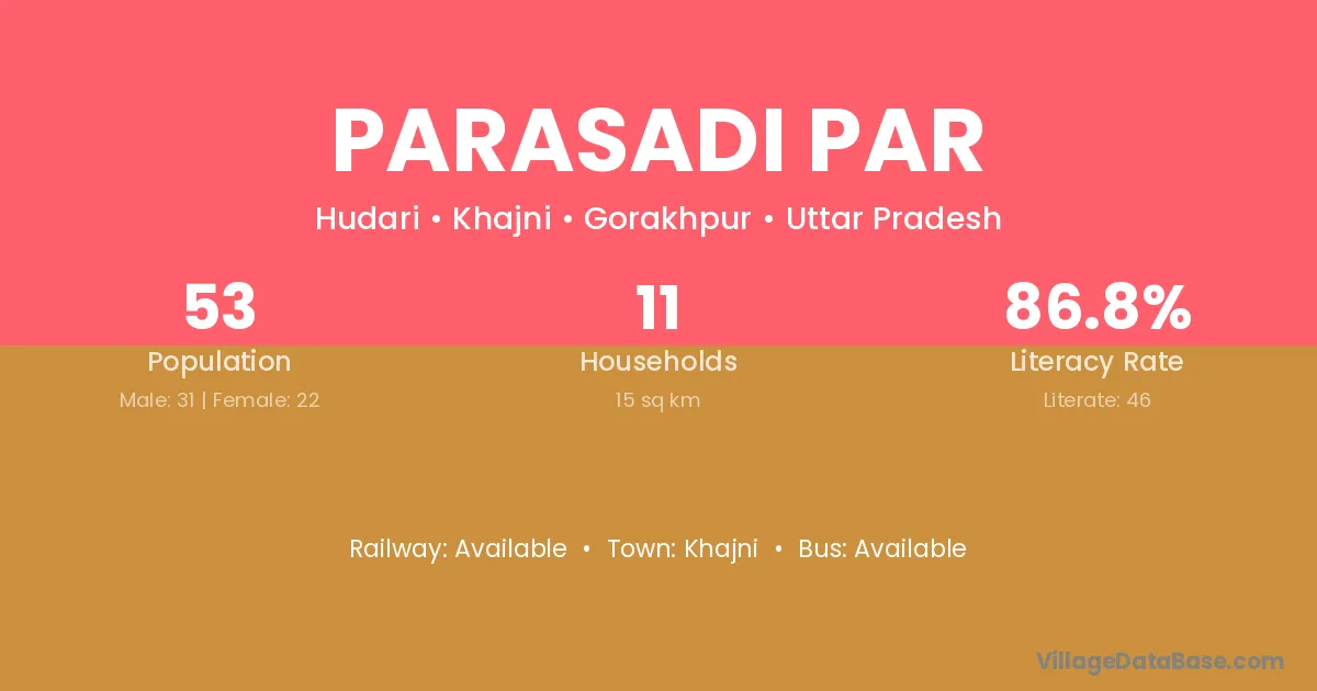 Parasadi Par village has a total population of 53 people, of which 31 are males and 22 are females.
