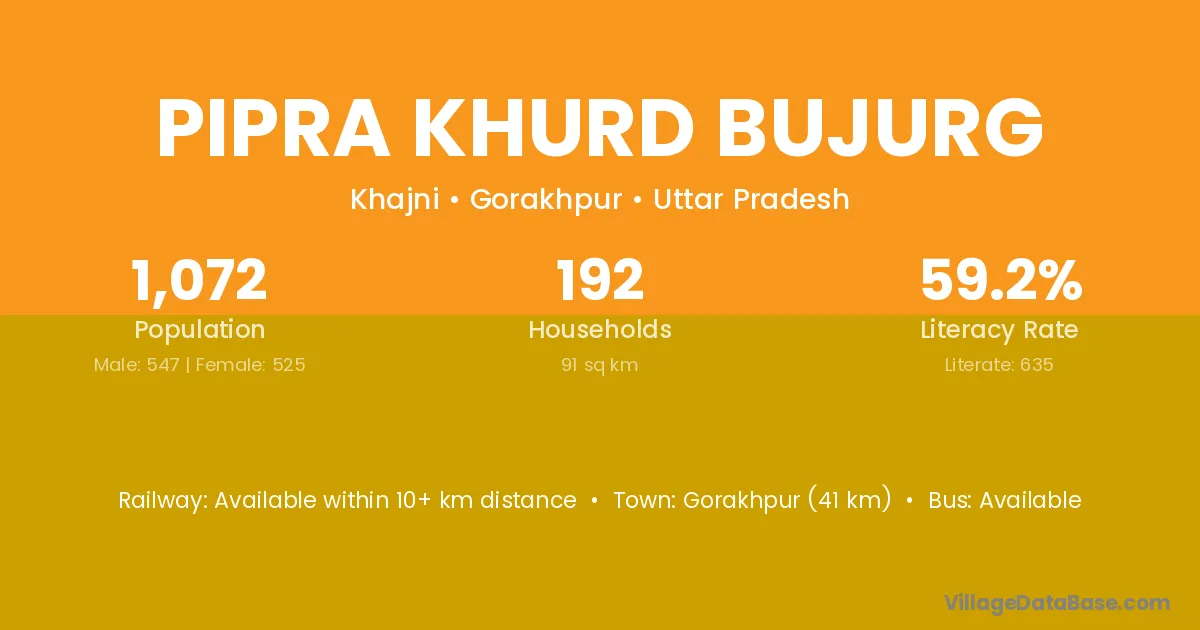 Gorakhpur (41 km) is the nearest town to Pipra Khurd Bujurg village for major economic activities and is located approximately 41 km away.