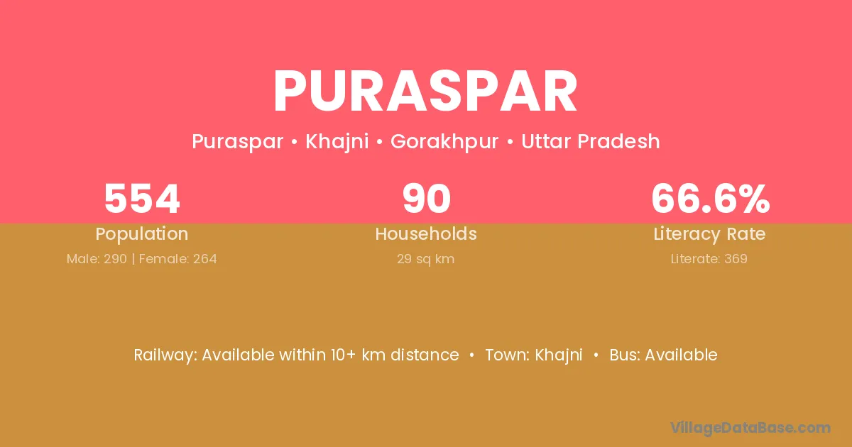 Puraspar village has a total population of 554 people, of which 290 are males and 264 are females.