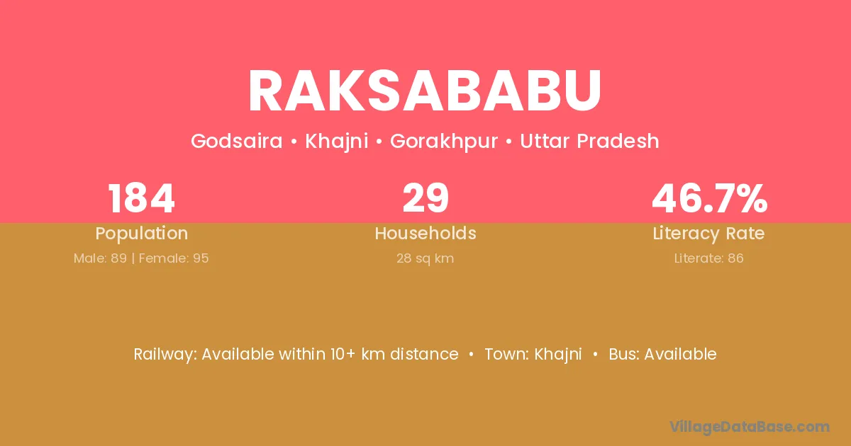Raksababu village has a total population of 184 people, of which 89 are males and 95 are females.