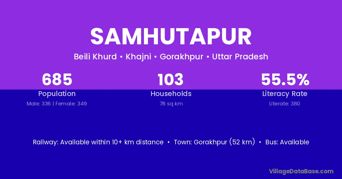 Gorakhpur (52 km) is the nearest town to Samhutapur village for major economic activities and is located approximately 52 km away.
