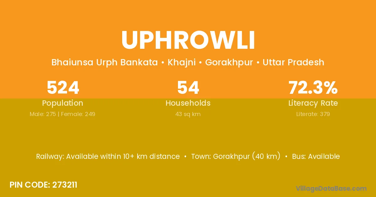 Gorakhpur (40 km) is the nearest town to Uphrowli village for major economic activities and is located approximately 40 km away.