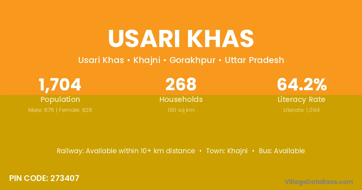 Usari Khas village has a total population of 1,704 people, of which 876 are males and 828 are females.