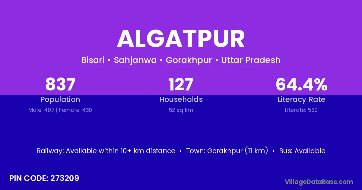 Gorakhpur (11 km) is the nearest town to Algatpur village for major economic activities and is located approximately 11 km away.