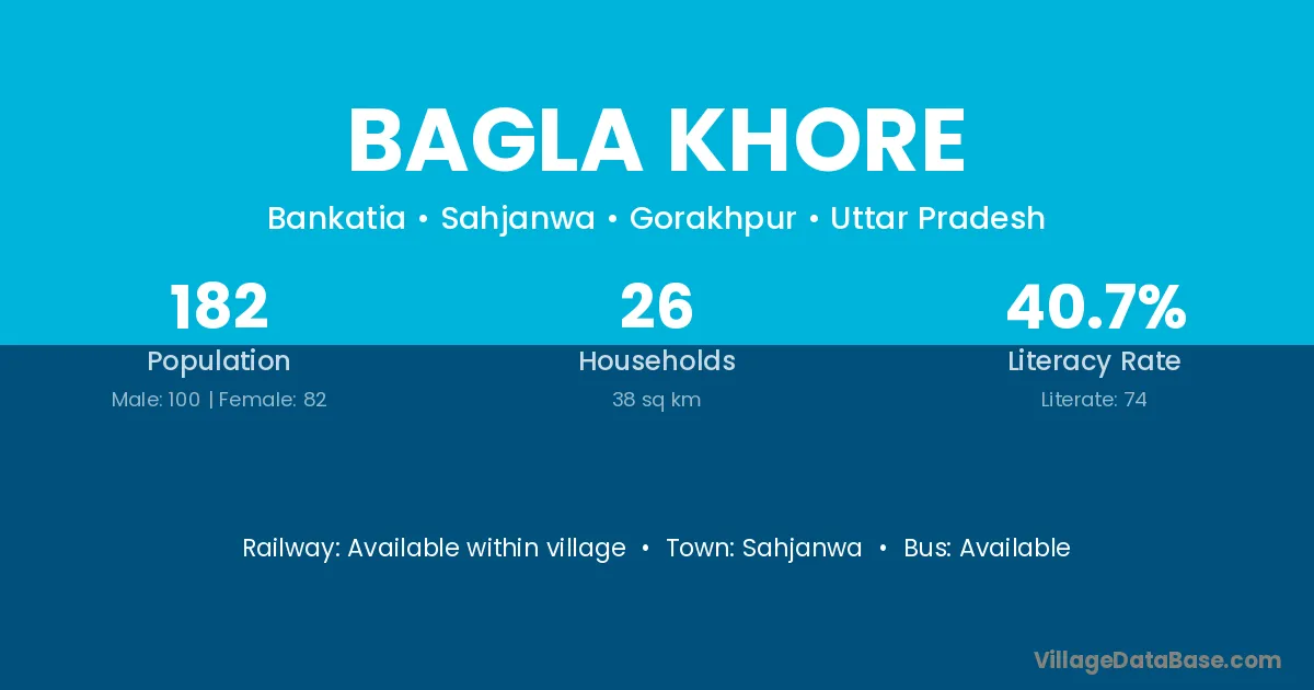 Bagla Khore village has a total population of 182 people, of which 100 are males and 82 are females.