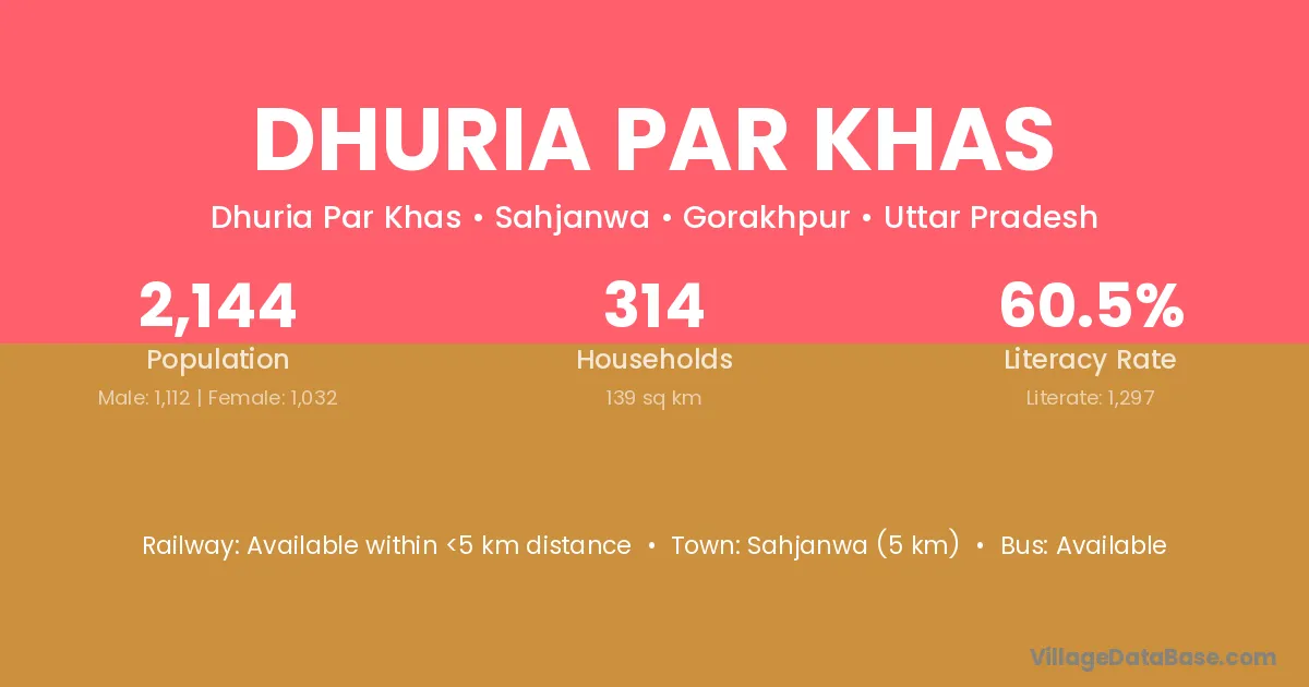Sahjanwa (5 km) is the nearest town to Dhuria Par Khas village for major economic activities and is located approximately 5 km away.