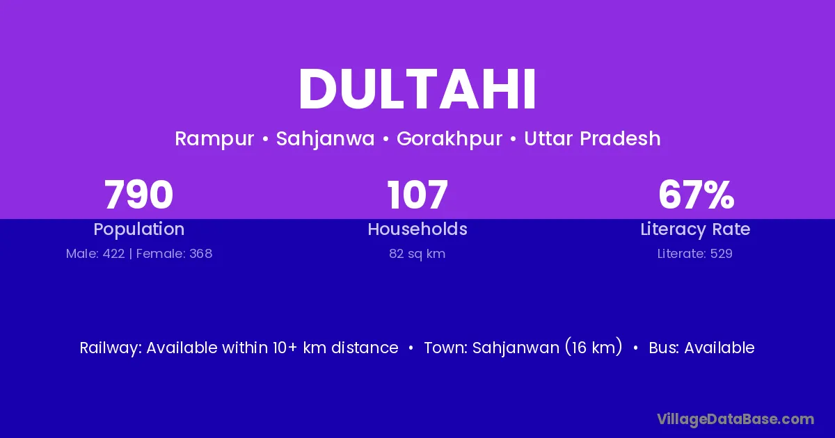 Sahjanwan (16 km) is the nearest town to Dultahi village for major economic activities and is located approximately 16 km away.