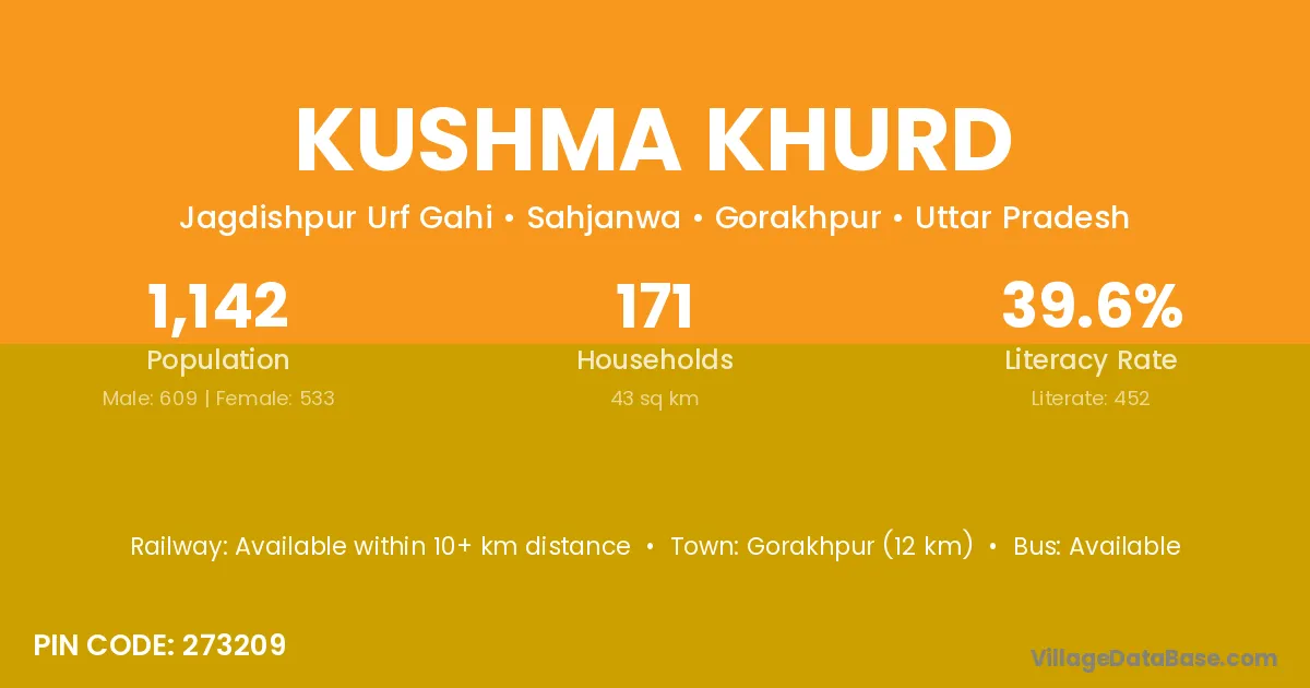 Kushma Khurd village has a total population of 1,142 people, of which 609 are males and 533 are females.