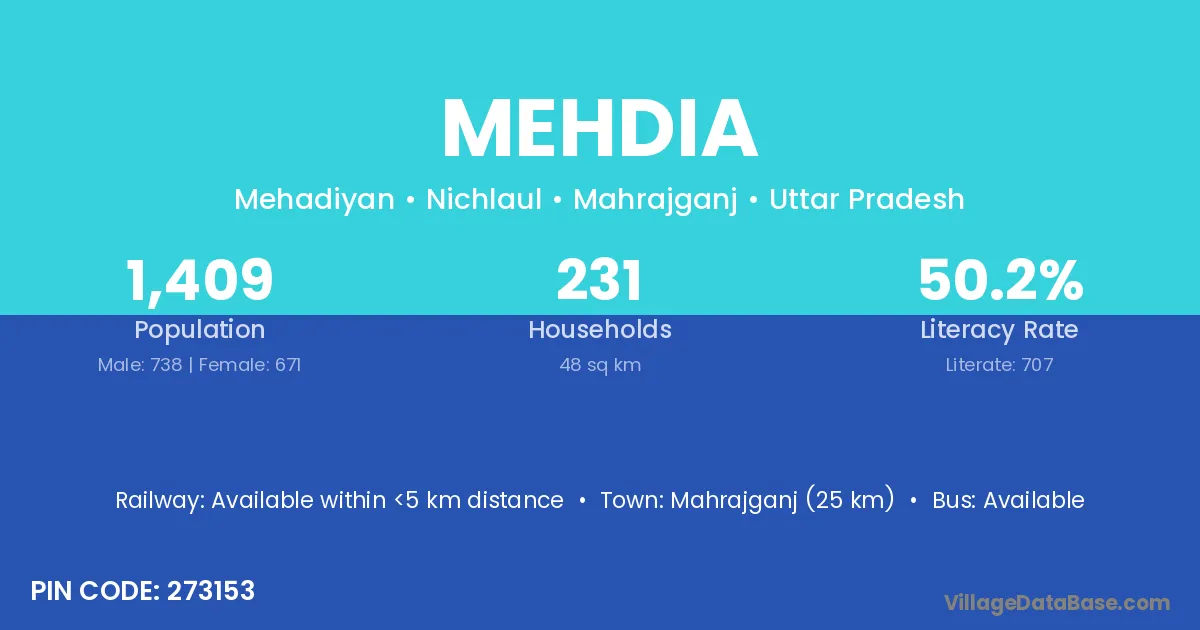 Gorakhpur (17 km) is the nearest town to Mehdia village for major economic activities and is located approximately 17 km away.
