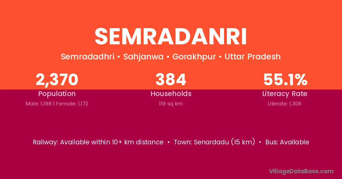 Senardadu (15 km) is the nearest town to Semradanri village for major economic activities and is located approximately 15 km away.