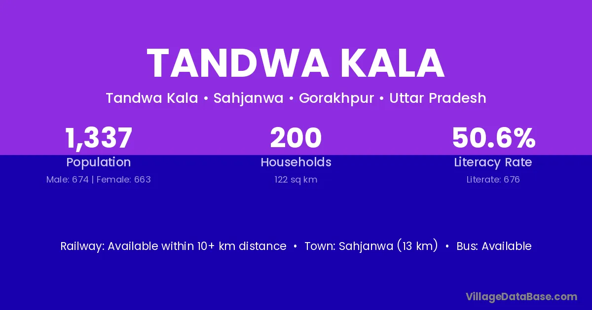 Sahjanwa (13 km) is the nearest town to Tandwa Kala village for major economic activities and is located approximately 13 km away.