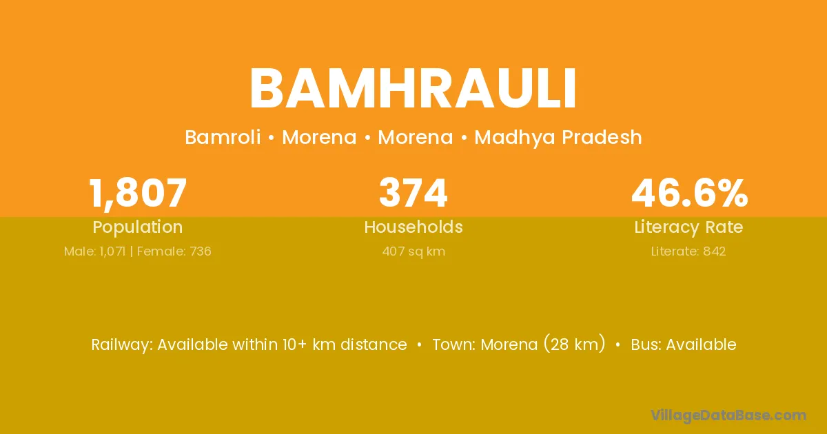 Bamhrauli village has a total population of 2,106 people, of which 1,078 are males and 1,028 are females.