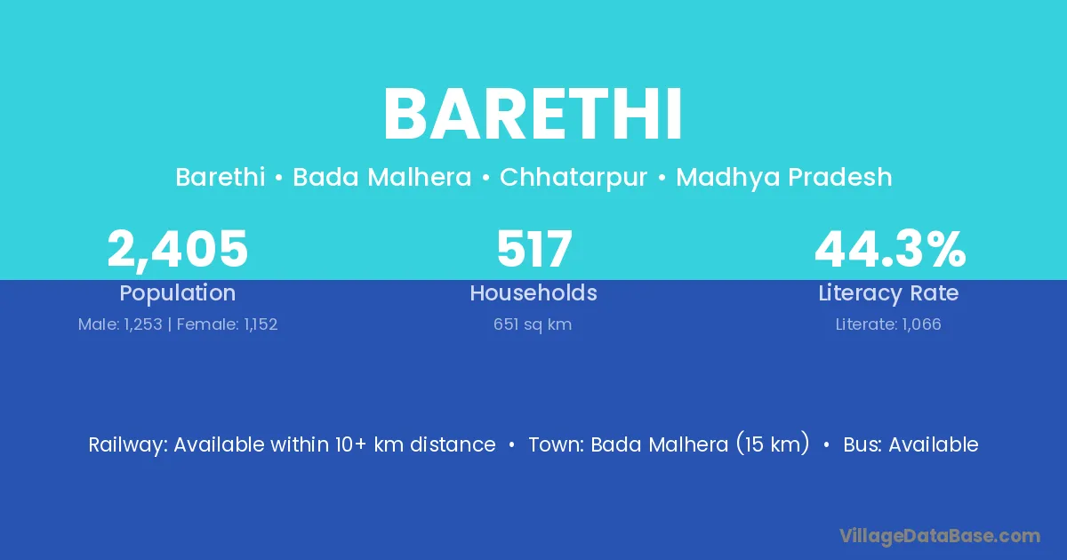 Barethi village has a total population of 33 people, of which 15 are males and 18 are females.