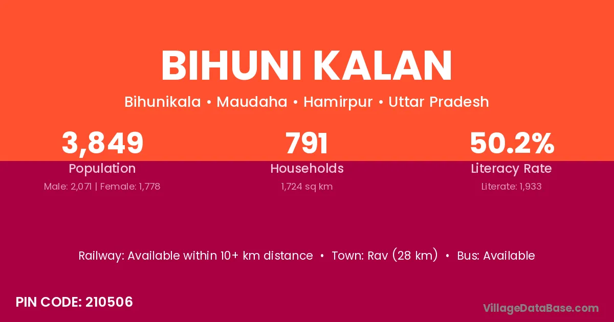 Bihuni Kalan village has a total population of 3,849 people, of which 2,071 are males and 1,778 are females.