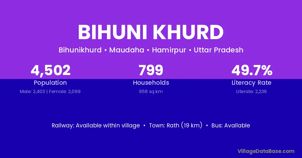 Bihuni Khurd village has a total population of 4,502 people, of which 2,403 are males and 2,099 are females.