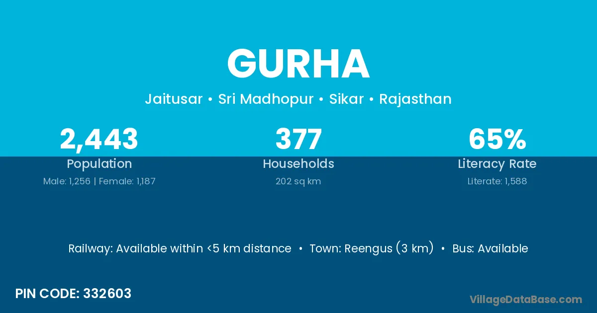 The literacy rate of Gurha village is 46.37%. Male literacy stands at 56.42% and female literacy at 35.24%.