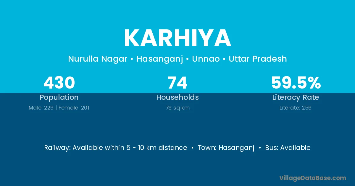 Maudaha (10 km) is the nearest town to Karhiya village for major economic activities and is located approximately 10 km away.