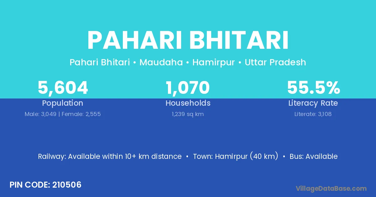Hamirpur (40 km) is the nearest town to Pahari Bhitari village for major economic activities and is located approximately 40 km away.