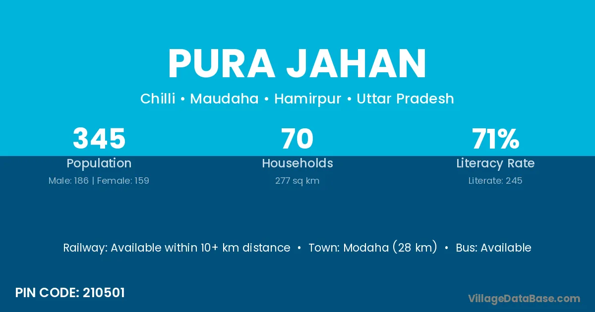 Modaha (28 km) is the nearest town to Pura Jahan village for major economic activities and is located approximately 28 km away.