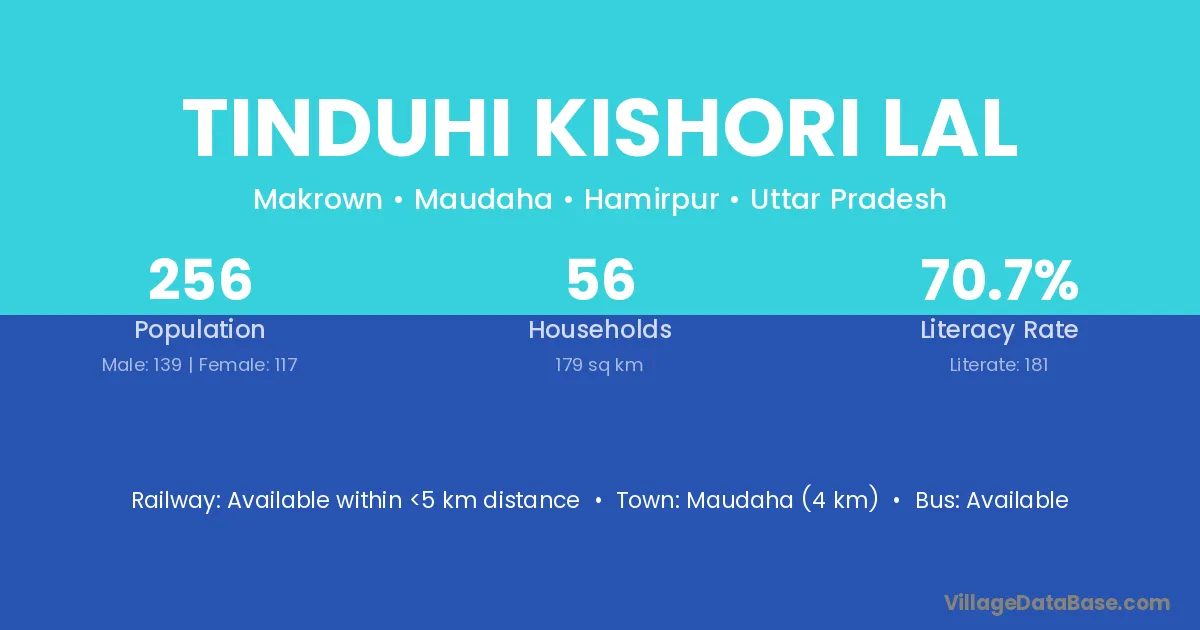 Maudaha (4 km) is the nearest town to Tinduhi Kishori Lal village for major economic activities and is located approximately 4 km away.