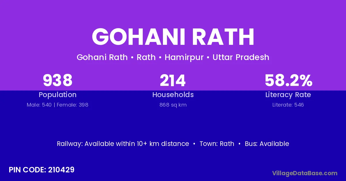 Gohani Rath village has a total population of 938 people, of which 540 are males and 398 are females.