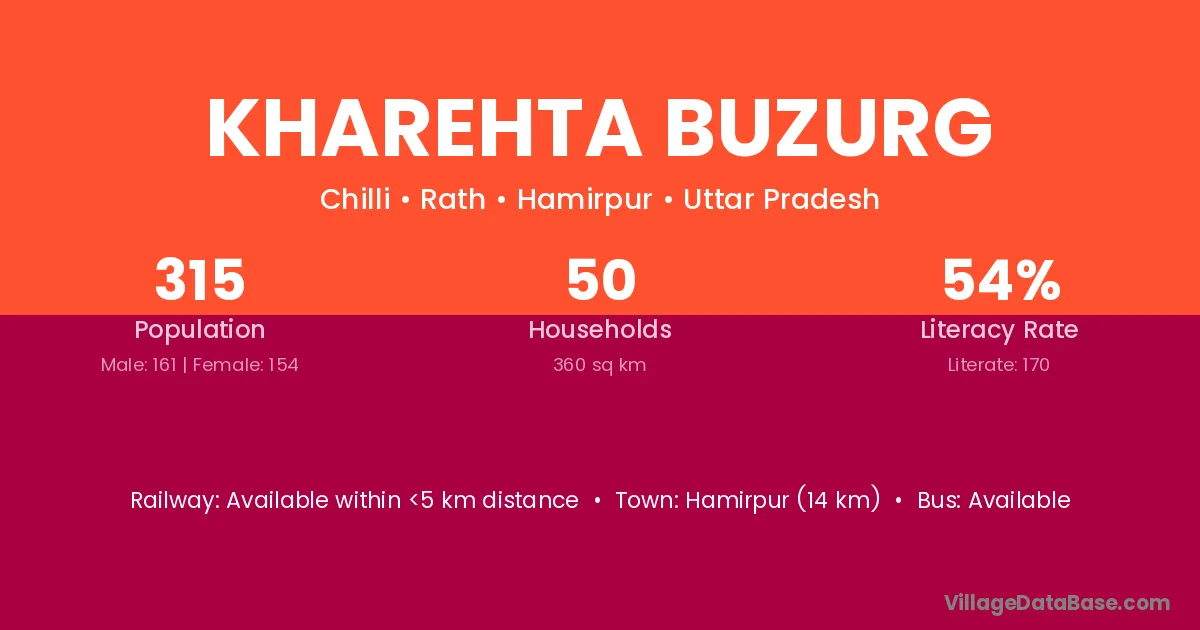 Hamirpur (14 km) is the nearest town to Kharehta Buzurg village for major economic activities and is located approximately 14 km away.