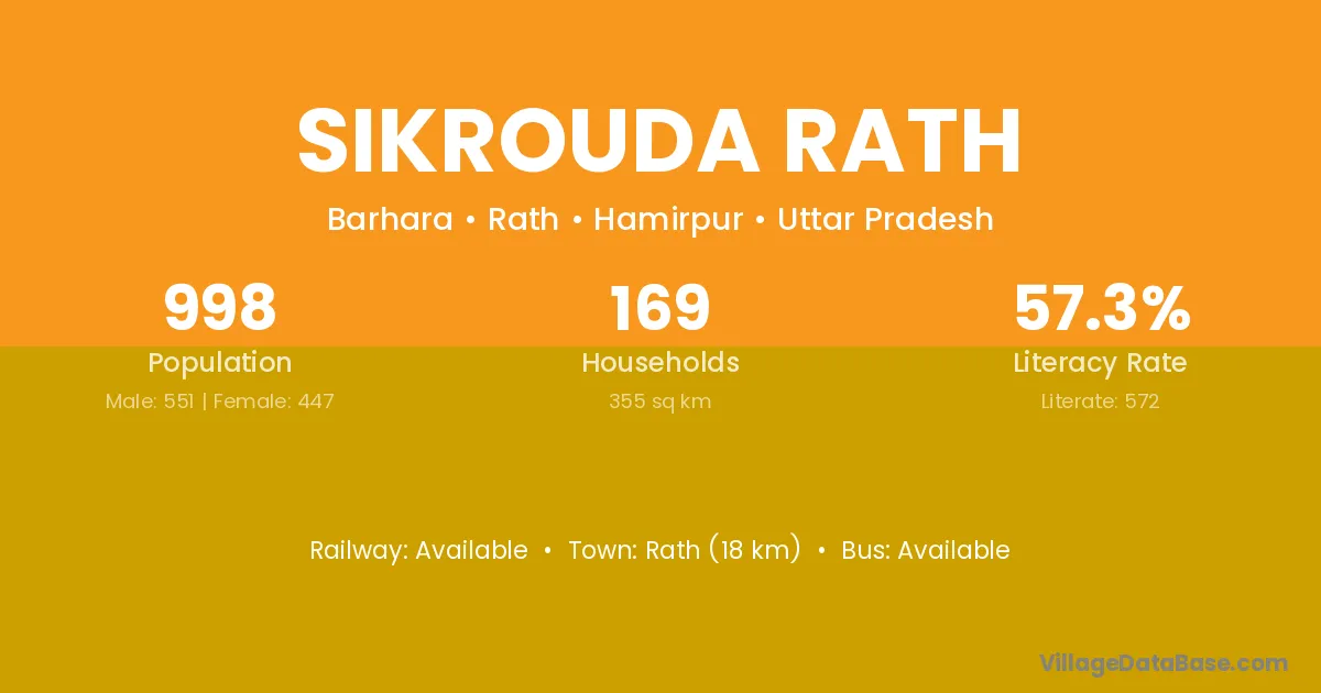 Rath (18 km) is the nearest town to Sikrouda Rath village for major economic activities and is located approximately 18 km away.
