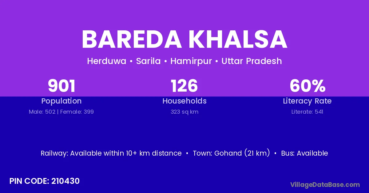Gohand (21 km) is the nearest town to Bareda Khalsa village for major economic activities and is located approximately 21 km away.